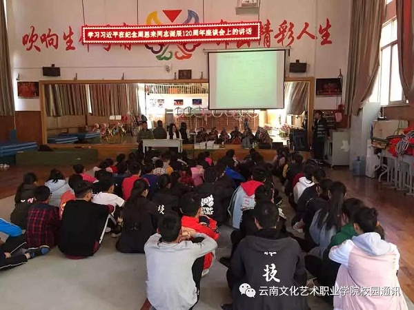 2018年3月5日,是周恩来总理诞辰120周年。杂技学院召集全院学生学习习近平在纪念周恩来同志诞辰120周年座谈会上的讲话并展开纪念活动,追忆总理英容风姿,传承恩来精神。活动由杂技学院共青团团支部书记黎明主持,杂技学院辅导员罗碧莹、班主任代表宋宁、鲁睿参加活动。