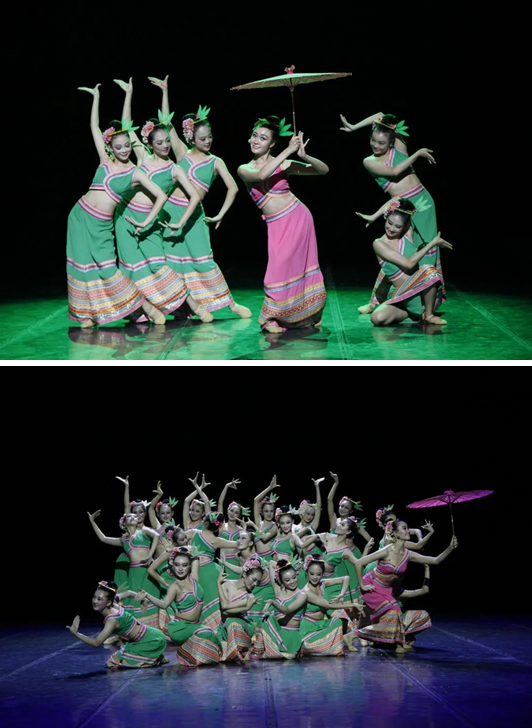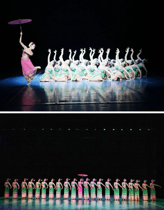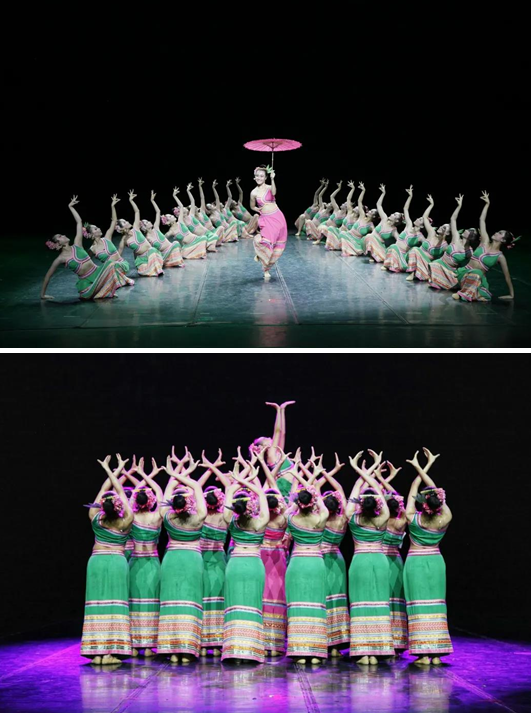 作品《勐尤芬芭美》以“人与自然和谐共生”为主题,展现了一名傣家少女被林中鸟儿美妙的歌声吸引,跟随它渐渐步入雨林之中,推开了雨林神秘的面纱。少女与百花共舞、与鸟儿溪流共唱,欢快的歌声与舞蹈洒满竹林,形成一幅人与自然和谐共生的美好画面,充分体现了傣族人民对大自然的热爱与感恩、对和平幸福生活的赞美。