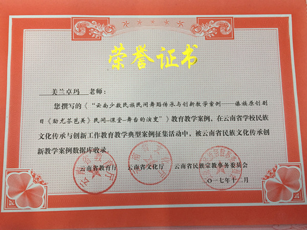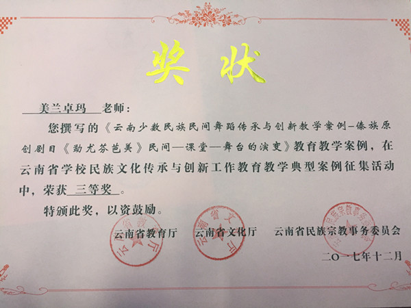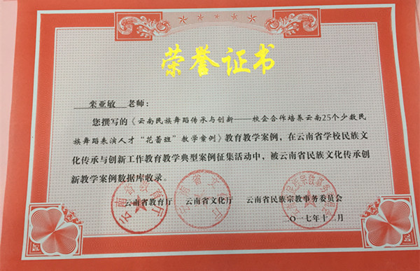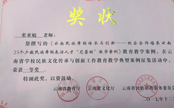 舞蹈表演专业作为首批100个全国职业院校民族文化传承与创新示范专业点,在民族文化传承与创新教育教学工作中积累了丰富的经验。舞蹈学院高度重视此次教学案例征集活动,积极组织教师投稿。根据《云南省教育厅 云南省文化厅 云南省民族宗教事务委员会关于公布云南省学校民族文化传承创新教学案例征集活动获奖名单的通知》(云教民〔2017〕20号),我院教师栾亚敏撰写的《云南民族舞蹈传承与创新-校企合作培养云南25个少数民族舞蹈表演人才“花蕾班”教学案例》荣获一等奖,教师美兰卓玛撰写的《傣族原创剧目“勐尤芬芭美”民间-课堂-舞台的演变》荣获三等奖,2篇教学案例由云南省民族文化传承创新教学案例数据库收录。