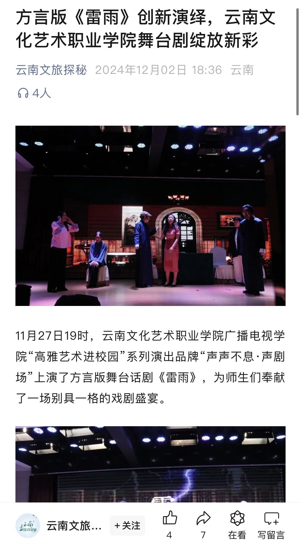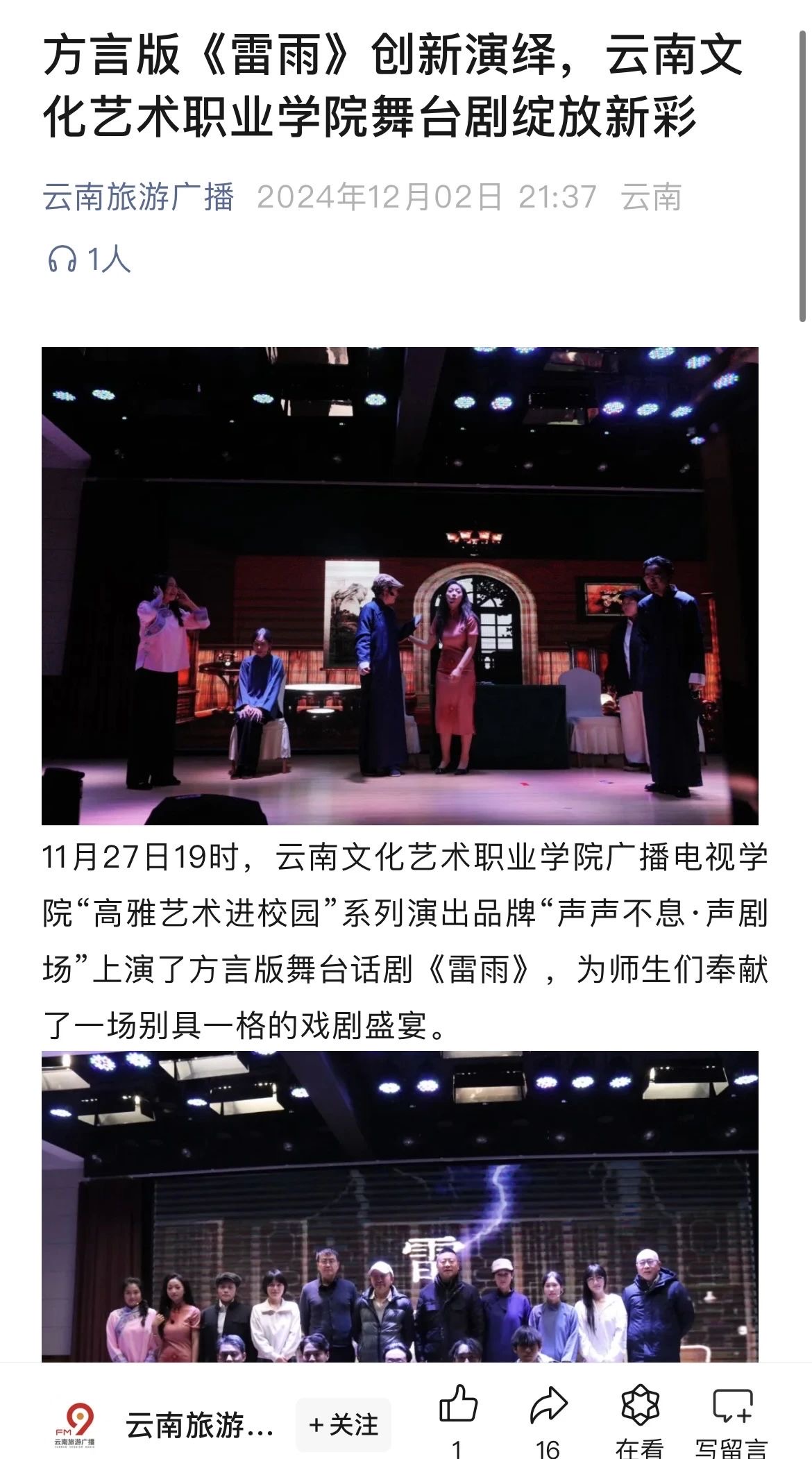 11月27日19时,云南文化艺术职业学院广播电视学院“高雅艺术进校园”系列演出品牌“声声不息·声剧场”上演了方言版舞台话剧《雷雨》 受到云南文旅探秘和云南旅游广播两家省级媒体关注。