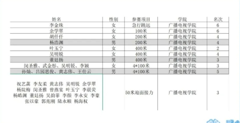女子4×100米接力队(23融媒闵圣雅、23信安武金彤、24播音李颜、24播音吴明锐)默契配合,以行云流水的交接棒拿下第3名;