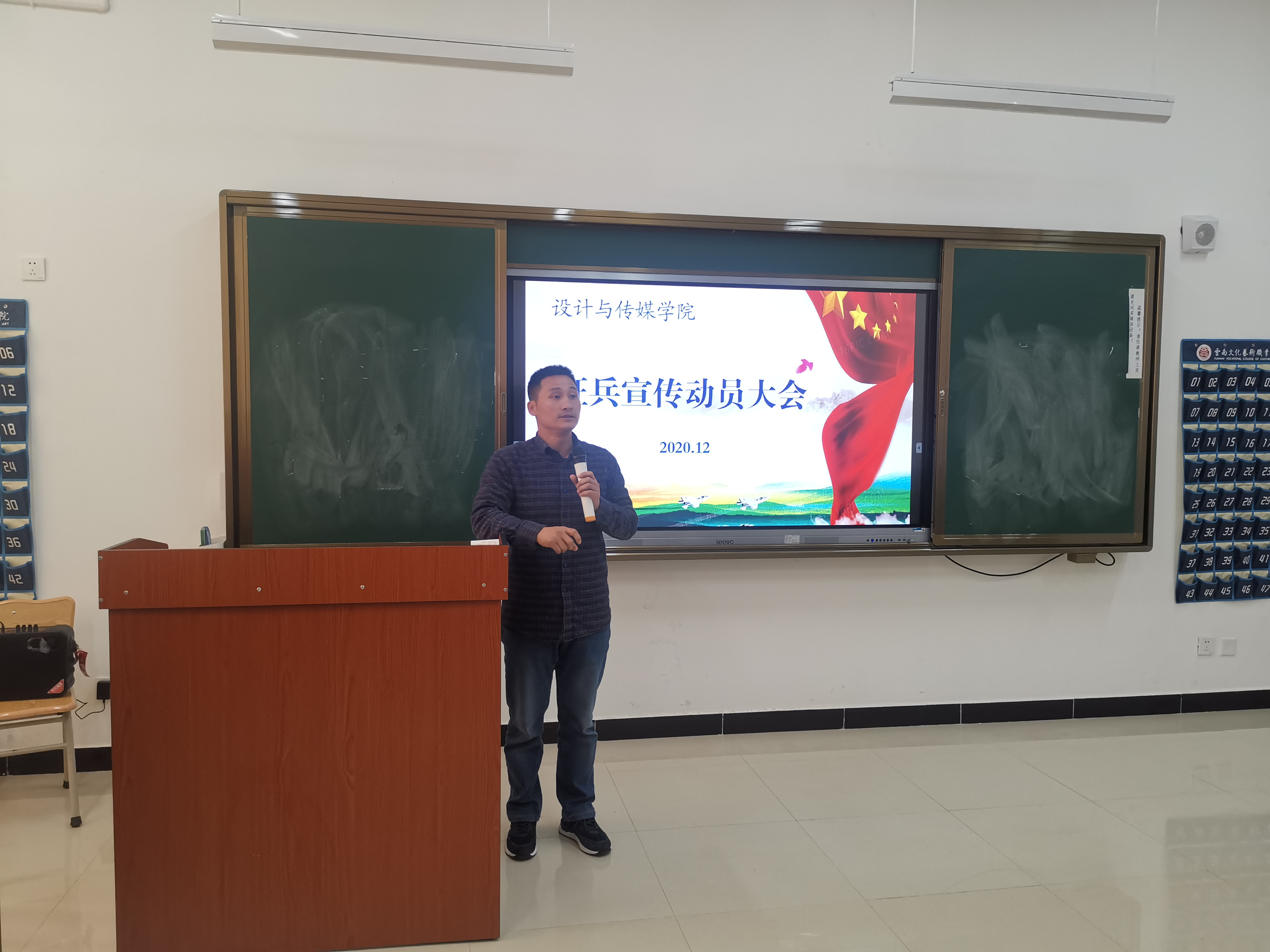为深入贯彻落实习近平总书记的强军兴军思想,响应国家征兵政策,增强师生国防意识,鼓励更多优秀大学生携笔从戎,投身军营建功立业。2020年12月17日下午,设计与传媒学院直属党支部举行了征兵宣传动员大会。出席大会的有云南文化艺术职业学院武装部部长黄昌华同志、设计与传媒学院直属党支部书记王贵能同志、政治辅导员杨爱笛以及彭婷婷同志、2021届毕业班全体男生,此次动员大会还特别邀请了音乐学院退伍军人喻哩同志。