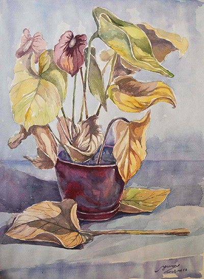 01、<<轮回>>—— “轮回”主要表现一棵红掌枯萎的样子,在这个过程中有绿、黄、褐色,再现植物生长的过程,从而体现出人的生命和植物一样,都有自己一个生命轨迹,枯萎是为了再生即为轮回。 尺寸:53X38 单位:mm
