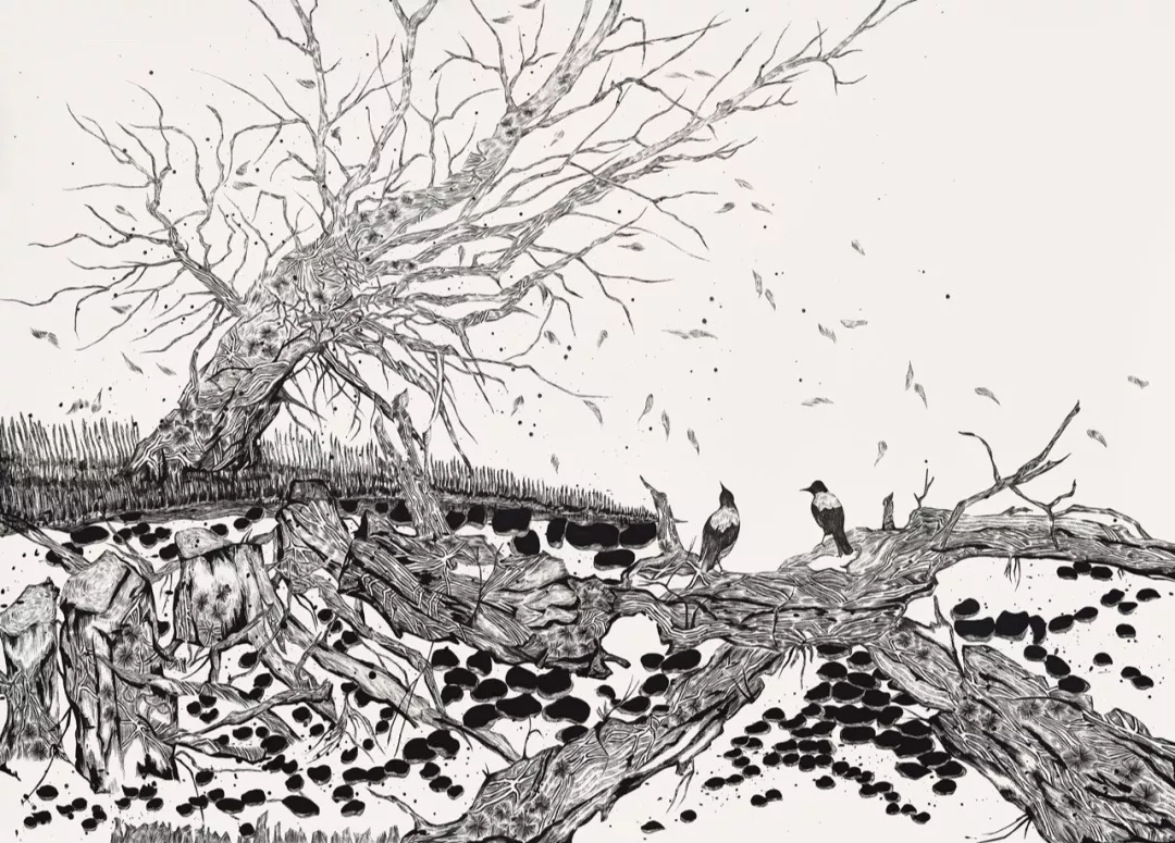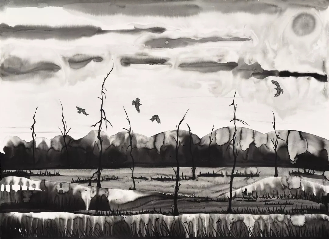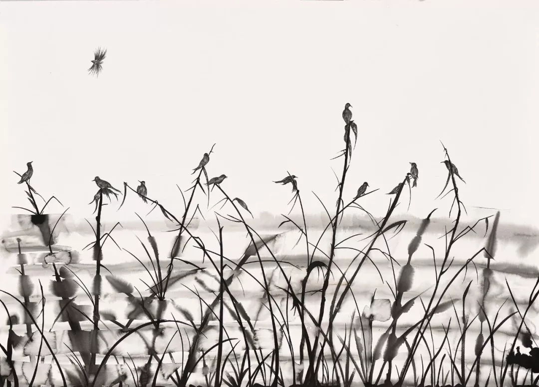 与他对谈“绘画”这个命题的时候,他的回答与理解纷纷印证了我的理解与猜想,正如我对他为人处世的了解一样。家泰的绘画虽然沿习了传统水墨纵情于山水之间的气息,但是在画面的处理上,他有着自我的追求和见解。他是朴实的,他所做的仅仅是把三年里每一天的时间都转换成了笔画,如同做加法一般不断印刻在了画纸上,而投过采用不同的笔法的叠加,将心中所看见的景色仔细勾勒出来。同时他亦是细致的,作品中笔触每一丝一毫都能看得出经过独立思考与个人经验博弈的最终体现,这是六年内他对自我做加法的结果。从一开始相对犹疑不决的笔触到如今收放自如并带有个人强烈审美意向的画面处理方式的变化内部,唯一不变的是画面中一直不曾透露出过多的工业与后工业时代的气息。草原、湖边、山野、荒原等皆能显示出生命的繁盛的景象,才是家泰心中追求的作品呈现。或许是因为只有在这种毫无污染远离尘俗的心境下,这一系列作品才得以自由地从艺术家的手中萌芽并成长于此。