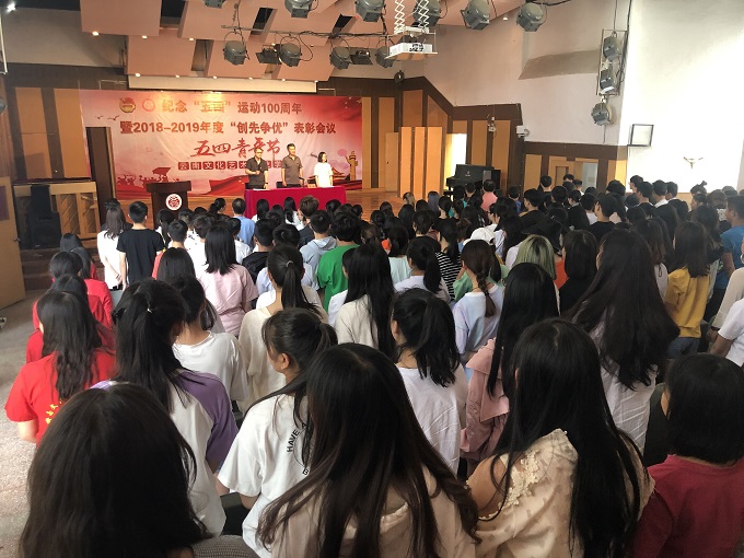 我校召开“ 五四运动”100周年暨年度创先争优表彰大会,纪念五四运动100周年暨2018-2019学年“五四创先争优”表彰大会于5月9日中午12:30在音乐厅隆重召开。出席会议的有学院党委委员、副院长翟斌;团委书记学生处处长张觅;学工部学生处副处长左欣悦及二级学院党总支副书记、团总支书记、辅导员及获得表彰的个人和集体200余人。会议由团委书记学生处处长张觅主持,表彰在2018—2019年度表现突出的集体和个人,云南省三好学生、优秀干部、优秀班集和校级优秀团组织、优秀共青团干部、优秀共青团员。共分为四项议程: