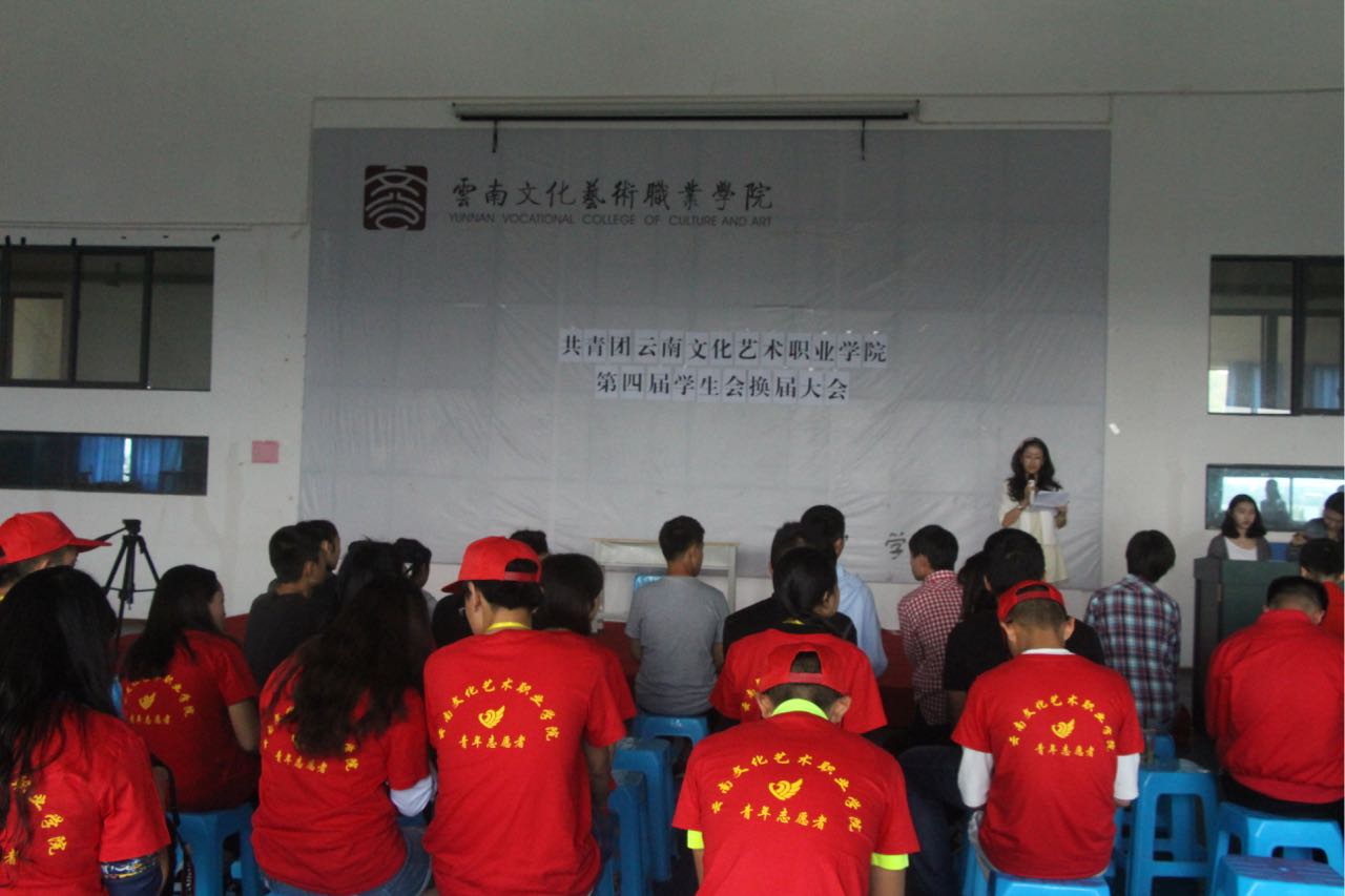 2016年9月27日中午十二点,云南文化艺术职业学院,院学生会在学生之家召开了第四届院学生会换届大会,出席本次大会的有:院团委老师倪薇,学生处的周其霖老师以及院社联主席团、院青协大部分同学、各二级学院的学生会主席团。