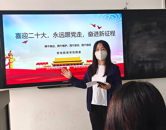 为深入学习贯彻习近平总书记关于青年和共青团工作的系列重要论述精神,迎接党的二十大胜利召开,庆祝中国共青团成立100周年,4月14日下午14时,文化旅游学院团支部在教学楼3-307组织了“喜迎二十大、永远跟党走、奋进新征程”主题团日活动。活动由文化旅游学院团委书记晏煜斌老师主持,各班团支书及有入团意向同学参加,党支部副书记宋寅诚老师到会指导。