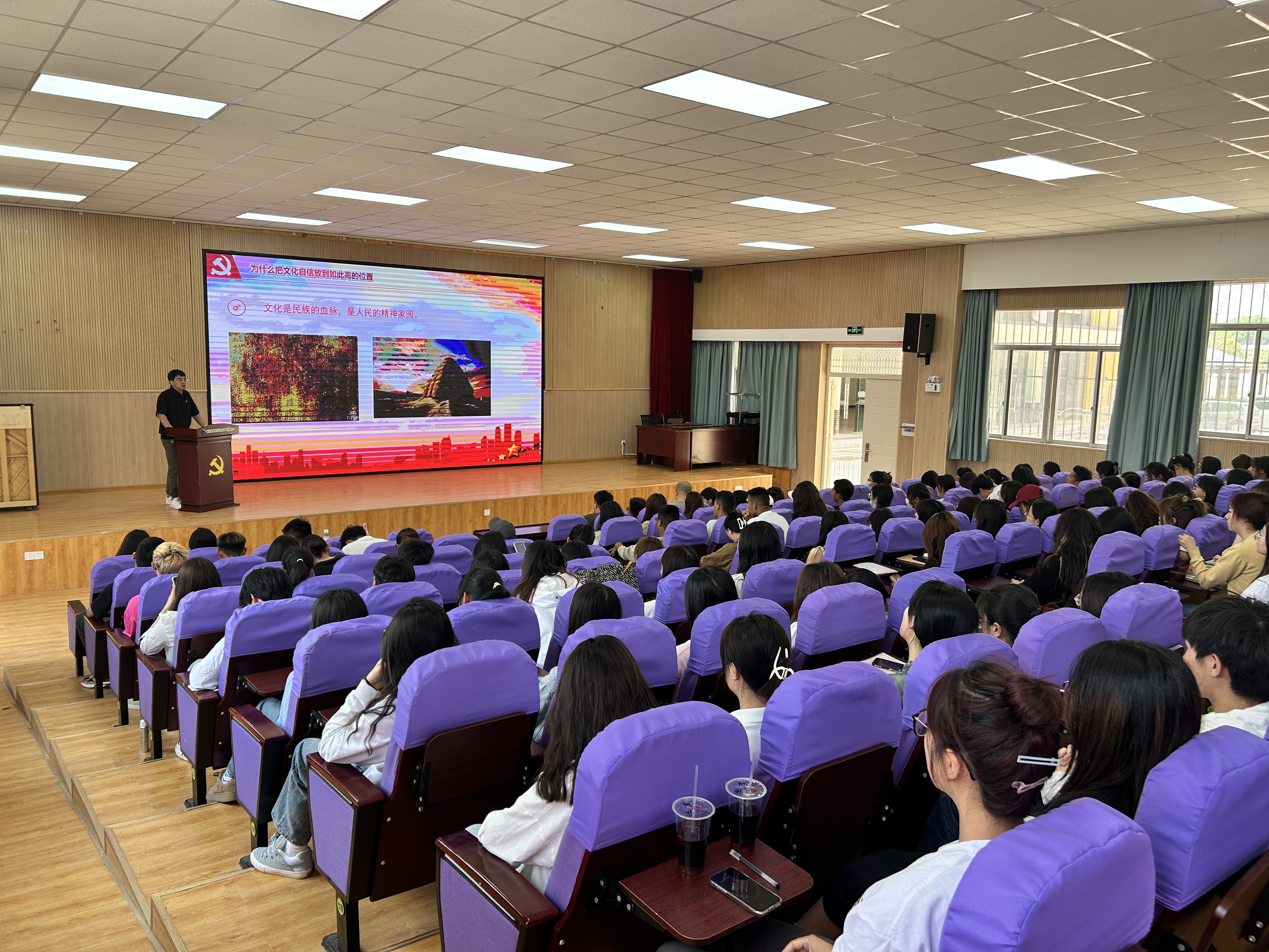 为深入学习宣传贯彻党的二十大精神,引领广大青年学生牢记习近平总书记的殷殷嘱托,立志做有理想、敢担当、能吃苦、肯奋斗的新时代好青年,4月19日文化旅游学院团委开展了以“坚定文化自信,争做时代青年”为主题的团课。本次团课由文化旅游学院党支部副书记宋寅诚老师主讲,二级学院党政班子领导、辅导员、教师代表、各班团支书、入团积极分子及学生代表共计200余人参加。