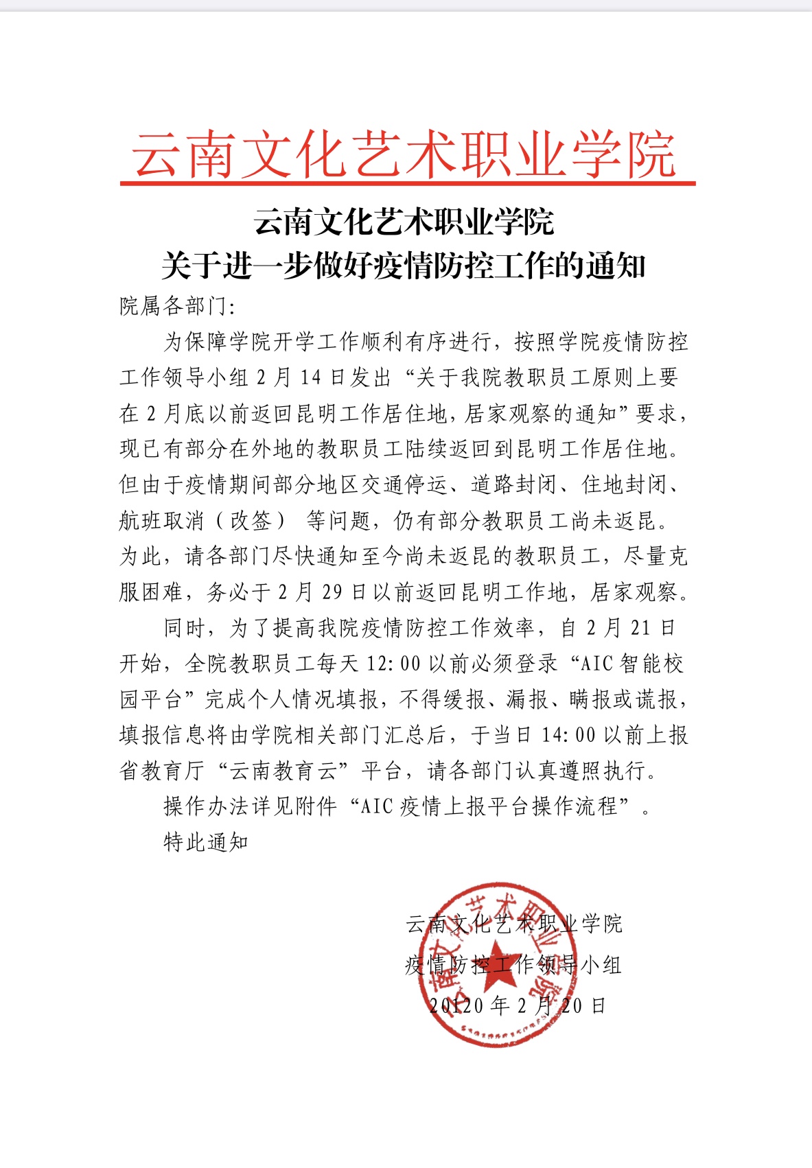 云南文化艺术职业学院关于进一步做好疫情防控工作的通知