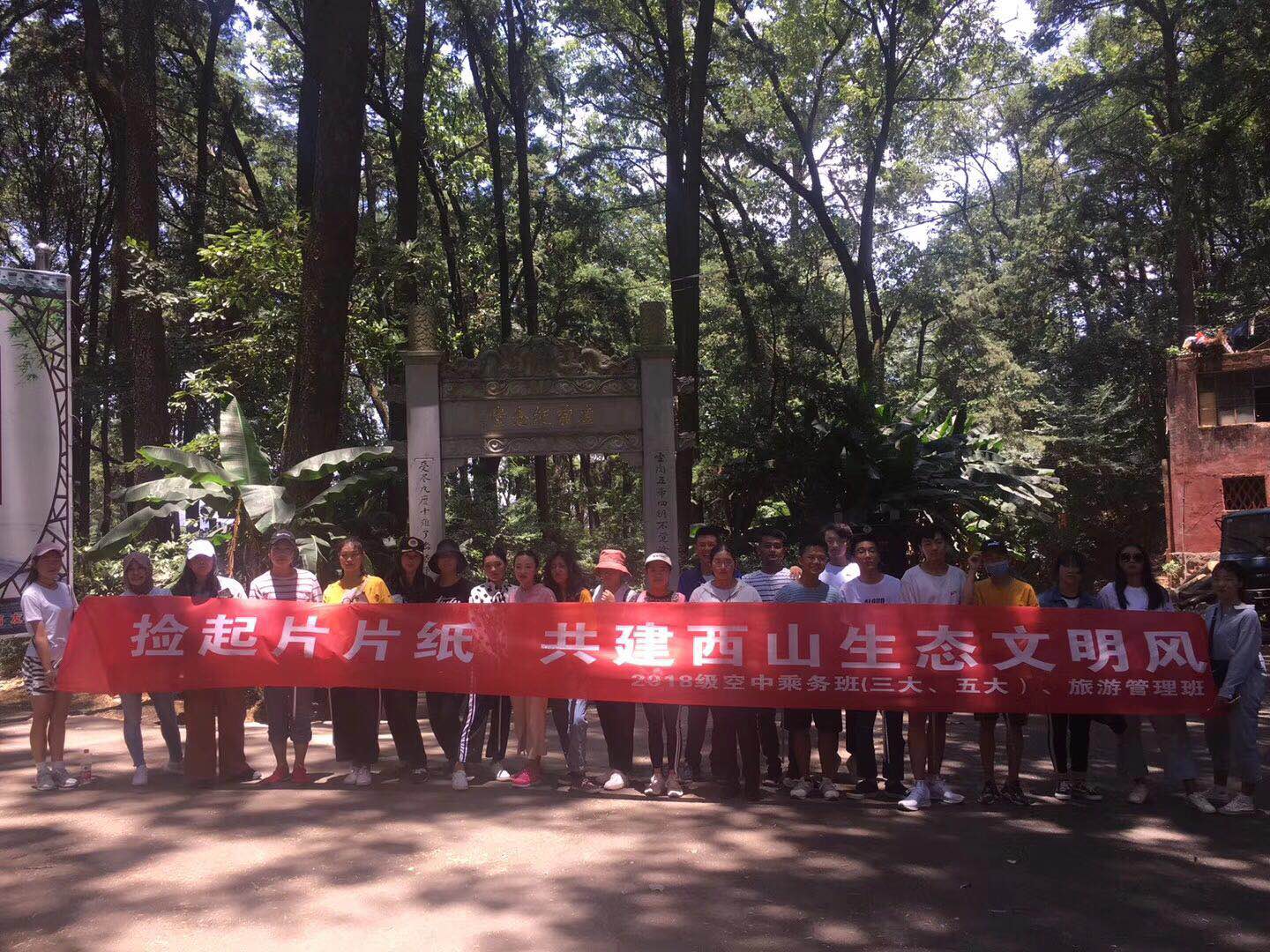 中午12时30分综合艺术学院2018级文化市场经营管理、旅游管理、空中乘务、文秘专业同学们沿着崎岖的山路,进入西山风景区,把山路上的塑料包装袋、饮料瓶、烟蒂、纸屑等捡起放到垃圾袋中,并最终将垃圾带离景区处理。与此同时,2018级艺术教育、学前教育专业的同学们,在校内也分别对学校2号教学楼、3号教学楼楼道及部分教室进行卫生打扫。