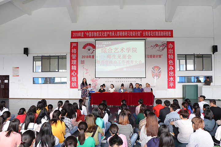 8月27日,云南文化艺术职业学院综合艺术学院师生见面会暨新生思想政治工作教育大会在3号教学楼404举行。综合艺术学院全体领导、相关职能部门负责人、新生班主任、辅导员、各任课教师和2019级全体新生共同参加此次会议。会议由学院党总支书记孙梓菱老师主持。