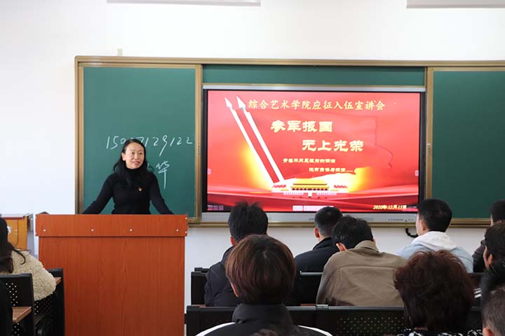 综合艺术学院直属党支部书记孙梓菱在动员讲话中指出,今天举行的征兵动员大会,是响应国家号召,充分发挥教育服务国防和军队现代化建设的职能,为推进国防和军队现代化建设贡献力量。学院党委高度重视征兵工作,积极配合相关部门做好组织、宣传、发动工作,积极在保留学生入学资格、国家资助学费、升学优惠等方面全力帮助大学生落实国家相关政策。希望同学们积极投身到实现中国梦的伟大实践中去,用青春和热血共筑中华民族不朽的钢铁长城,用奋斗的热情发出新时代的最强音,唱响伟大祖国的强军战歌,到八一军旗高高飘扬的地方实现自身的人生价值。