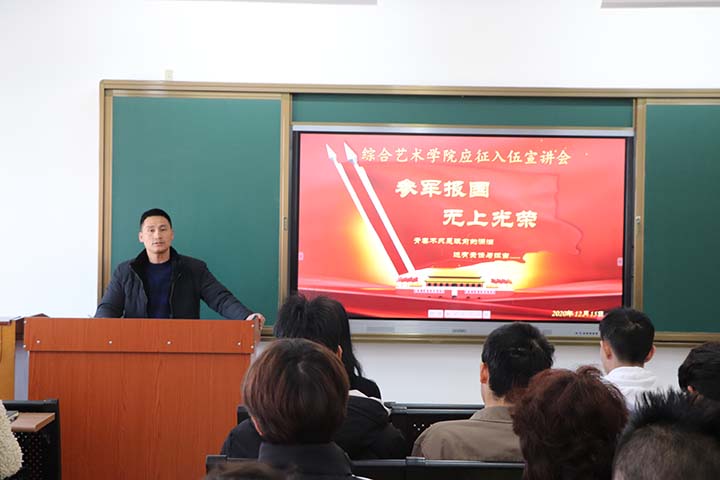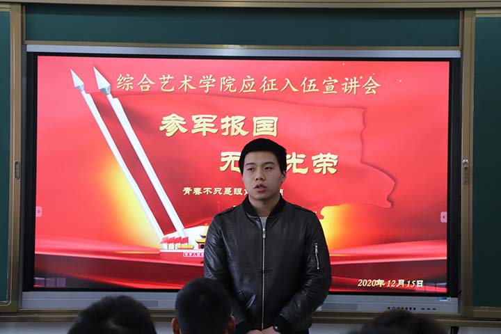 中华民族伟大复兴,需要强大的人民军队守护。党的十九大报告中提出“坚持走中国特色强军之路,全面推进国防和军队现代化,把人民军队全面建成世界一流军队”的奋斗目标,吹响了新时代强军兴军征程的号角。为支持和响应国家教育部和中央军委国防动员部的征兵入伍号召,扎实做好2021年大学生征兵宣传动员工作,12月15日下午12时30分,综合艺术学院2021年征兵宣传动员大会在1-104召开。校武装部副部长黄昌华、综合艺术学院直属党支部书记孙梓菱,综合艺术学院政治辅导及毕业班班主任,学院全体男生参加了会议。大会由综合艺术学院直属党支部副书记宋寅诚主持。