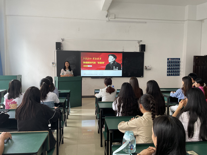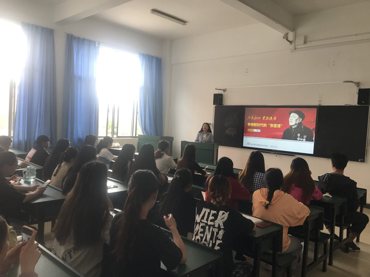 刘娢汐同志首先向同学们传达了习近平总书记对张富清同志先进事迹作出的重要指示精神,老英雄张富清60多年深藏功名,一辈子坚守初心、不改本色,事迹感人。在部队,他保家卫国;到地方,他为民造福。他用自己的朴实纯粹、淡泊名利书写了精彩人生,是当代大学生学习的榜样。随后向同学们讲述了老英雄张富清的先进事迹及获得的荣誉勋章及称号,73年党龄,60多年深藏功名,他用自己的朴实纯粹、淡泊名利,书写了自己精彩的人生。
