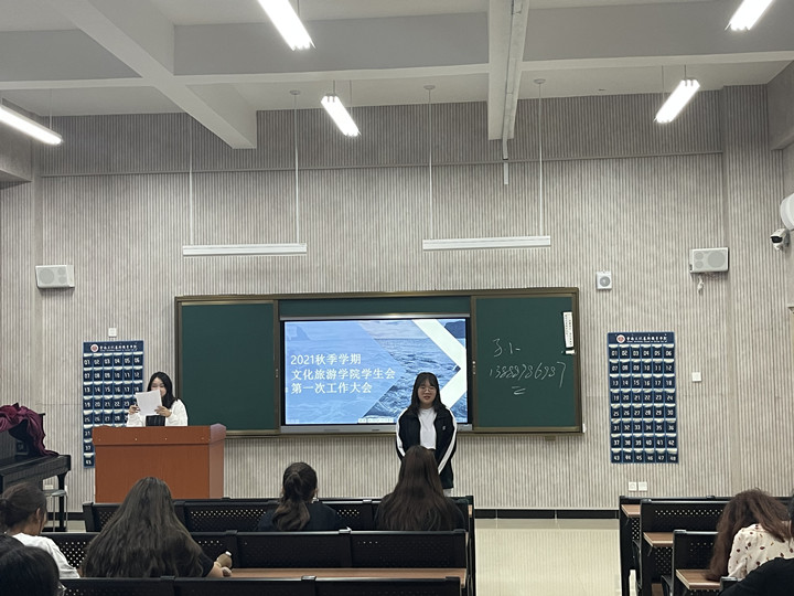 为庆祝中国共产党成立100周年,激发基层党组织活力,引导广大党团员厚植爱党、爱国、爱校的情感,在党建带团建,团建促党建,9月 15日下午 18:30,文化旅游学院学生会第一次工作大会在 1-104教室顺利召开。大会由文化旅游学院学生会主席李妮主持,文化旅游学院团委书记晏煜斌老师及学生会全体成员参加了此次会议。