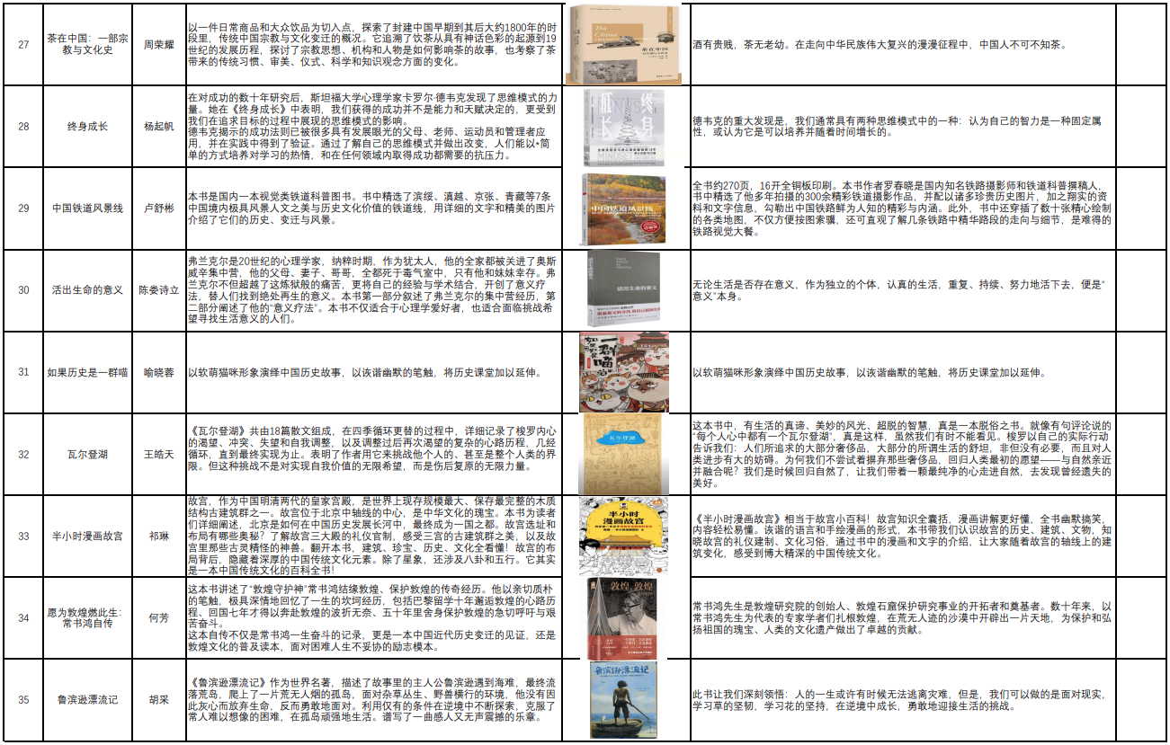 活动期间,文化旅游学院全体教师严格按照习近平文化思想的重要指示,筛选、推荐了一批既体现中华优秀传统文化精髓,又富有时代气息,能够启迪思考、陶冶情操的优秀图书。这些图书既有世界名著,如《傲慢与偏见》、《鲁滨逊漂流记》,也有现代文学的杰作,如《平凡的世界》、《额尔古纳河右岸》等;既有呼唤革命与斗争的读物,如《野草》、《红星照耀中国》,也有创新式知识普及读物《如果历史是一群喵》、《半小时漫画故宫》等。