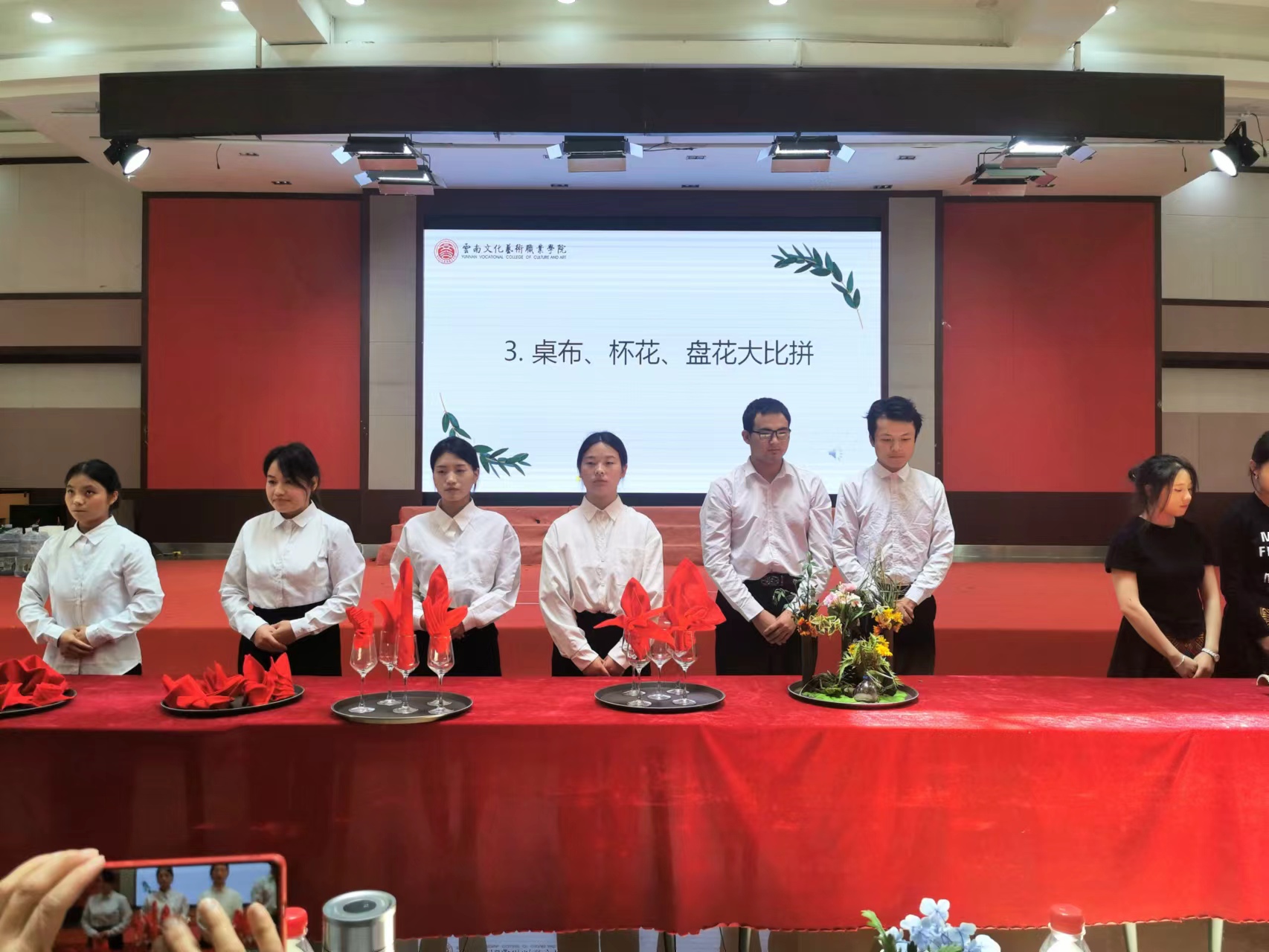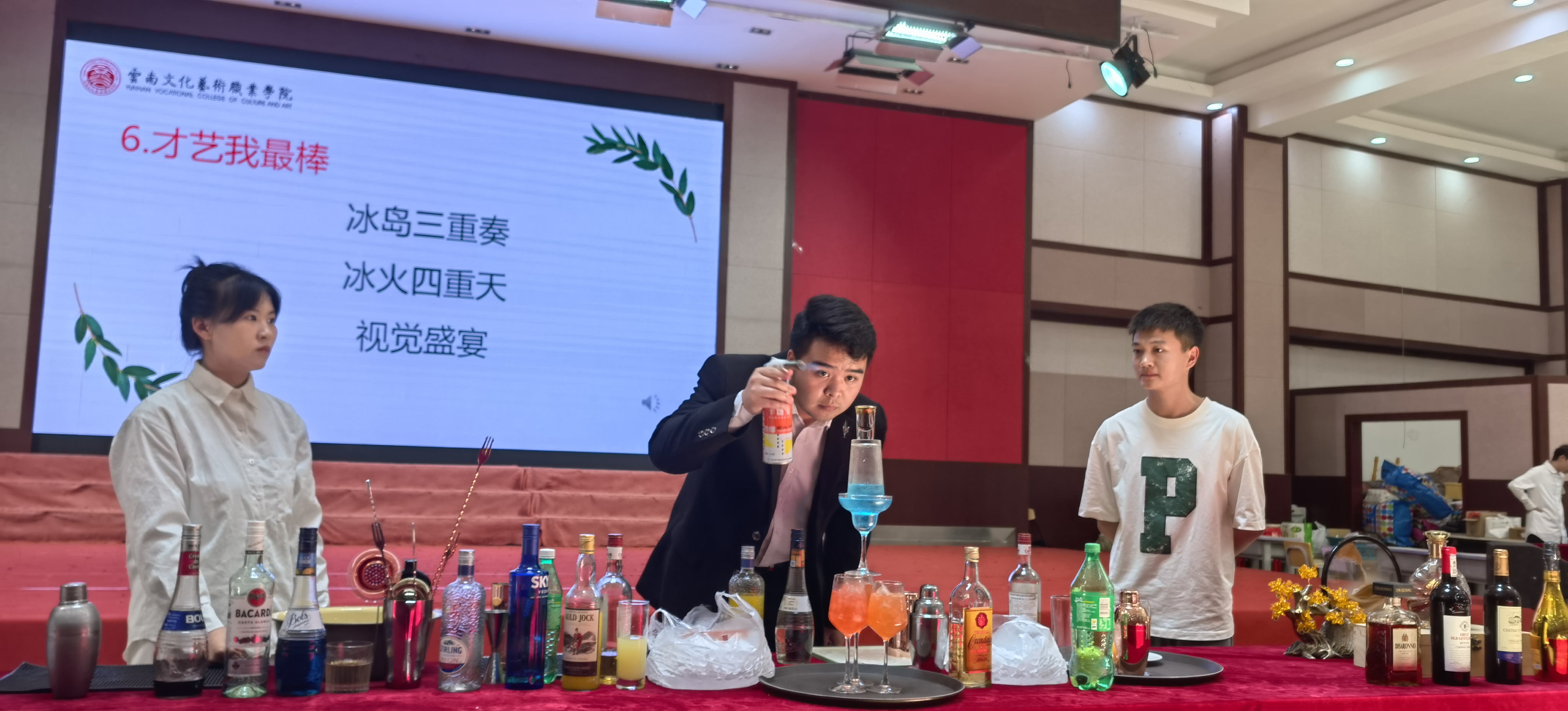 开篇以国际酒店服务礼仪演绎拉开序幕,在鼓乐齐鸣声中,酒管的小伙子带来了抛杰克棒的杂耍表演,现场掌声四起。宴会前布场项目组的同学们在短短几分钟内就呈现出了精美的中餐宴会台面设计,心灵手巧的酒管学子折叠出了栩栩如生的各种餐花和盘花,用竹子和各类应季植物制作了诠释“环保”和“生态”理念的桌面中心装饰物。宴会中餐间服务涵盖了调酒、酒水品鉴、茶艺、果盘和咖啡的现场制作。各才艺组同学登台竞相角逐。鸡尾酒现场调制精彩纷呈,色彩斑斓,唤醒了现场师生的味蕾。酒水组带来了云南少数民族敬酒串烧和葡萄酒品鉴。同学们还结合了云南本土的地域文化特色,在酒店餐饮服务技能中讲起了云南普洱茶和小粒咖啡的故事:现代版斗茶和云咖呼唤。云南浓郁民族风和国际服务范儿的创新融合给观众留下了深刻的印象。现场还布置了师生的共同作品:鸡尾酒展台、茶歇展台和高星级酒店果盘展。