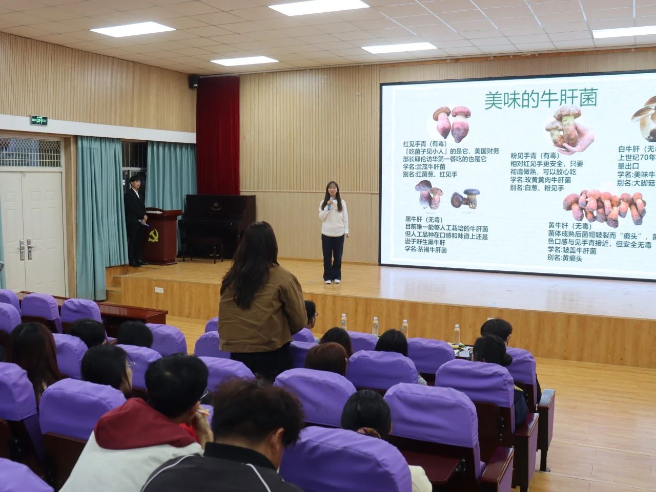 讲座围绕 “野生菌安全教育” 主题,采用图片、视频、趣味问答、有奖竞猜等形式。主讲人孔菲同学从野生菌历史溯源、种类介绍、有毒野生菌辨别方法、中毒案例及急救措施等方面为同学们进行讲解分享。有奖提问环节得到师生的积极响应,讲座氛围热烈。