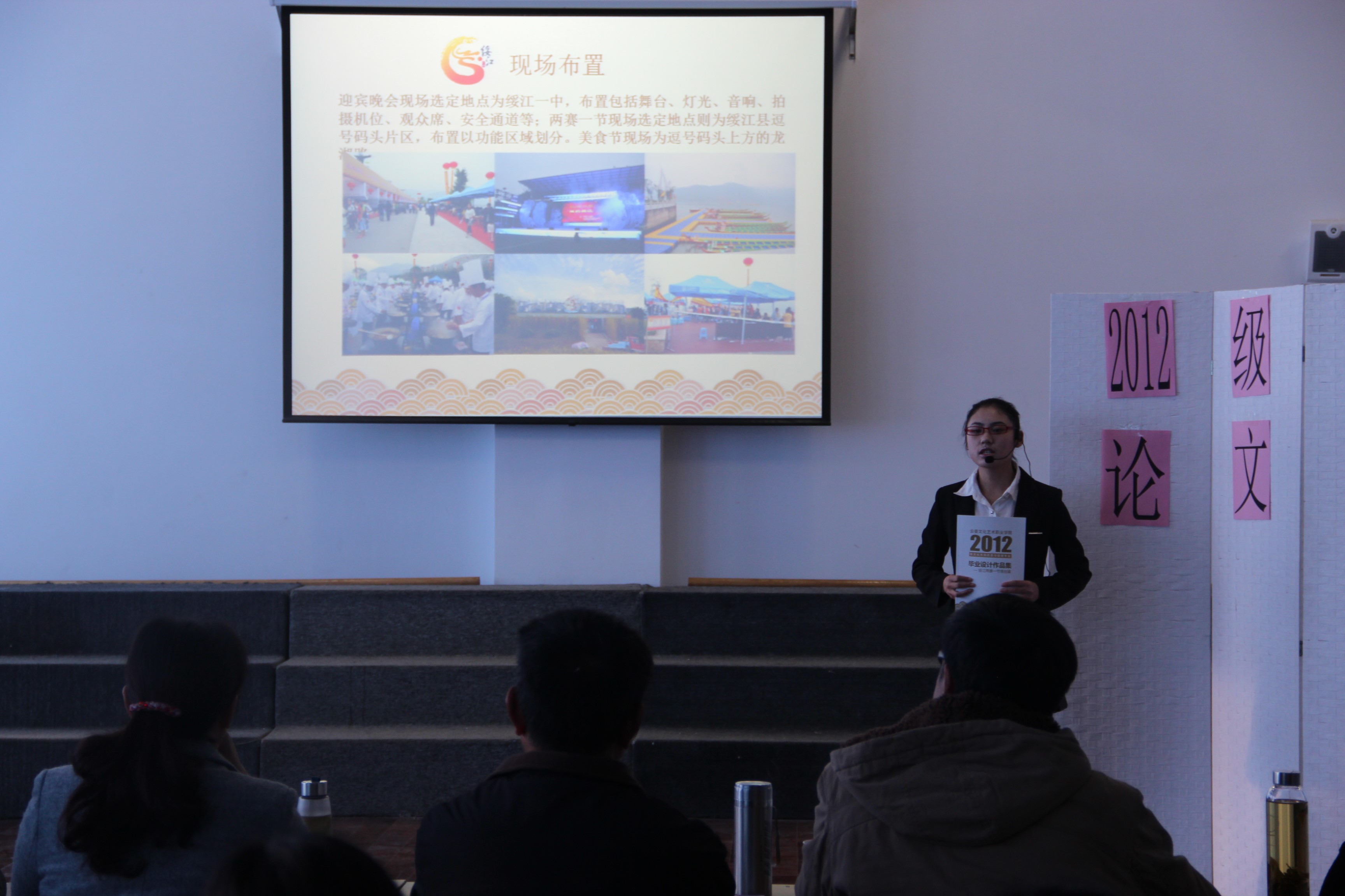 由学院办公室主任丁戎老师、通识教育中心主任何来标老师、图书馆筹建办公室主任、原公共管理系系主任韩萍老师、教务处副处长毕波老师、综合艺术与公共管理系副主任张汝兰老师组成的答辩委员会,认真观阅了文秘、文化市场经营与管理(会展策划方向)两个专业毕业生的毕业设计汇报,对两个专业毕业生近3年来的刻苦努力学习和近3个月的精心准备表示了充分的肯定。