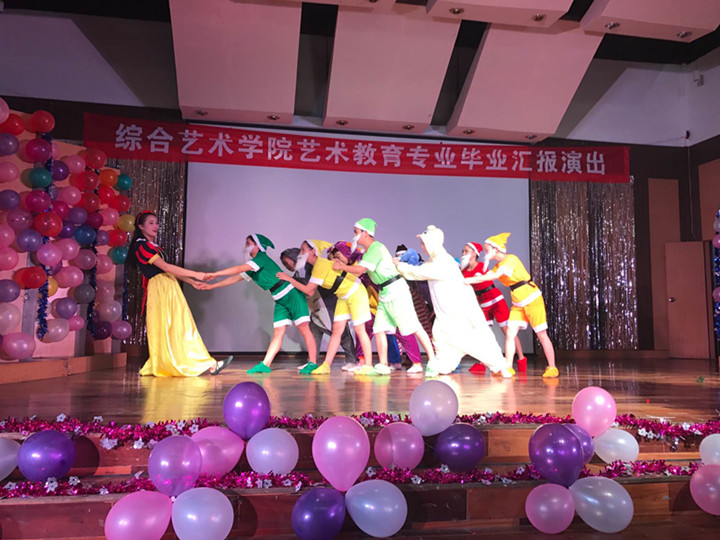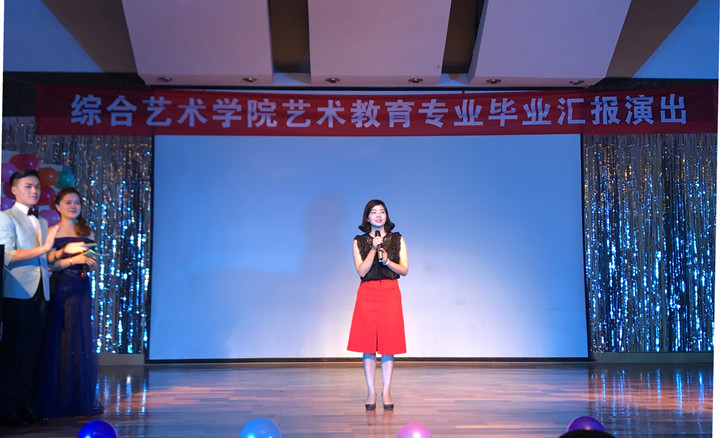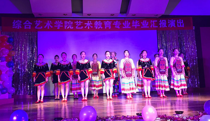 19时30分,艺术教育系系主任丁红芳老师为晚会致辞,预祝晚会成功,晚会以豪迈的合唱《酒歌》开场,一经开场就引发了全场的一片欢呼。充满童趣的《说课》、深情婉转的弹唱《月亮代表我的心》、考验基础功底的《视唱复调演示》、活力四射的歌舞《宠爱》、充满异域色彩《剪羊毛》、幼儿歌曲《左手右手》、婀娜多姿的古典舞《凉凉》、钢琴独奏《夜的钢琴曲五》、三人合唱伴着清幽自然风格音乐的《布谷鸟》在充分展示来自边疆民族地区的艺术教育专业学生精湛的艺术表现技艺之余,也映现出当代大学生特有的青春与活力。一曲饱含深情的独唱《母亲》更是充分表现出了母爱的无私与伟大。2013级电子商务班的同学以标准到位又优雅大方的礼仪操,一再地撞击着观众的视线,把本次毕业汇报演出推向了高潮。最后由2013级艺术教育专业学生编排的,充满梦幻与浪漫色的舞台剧《白雪公主》为本次2013级艺术教育专业毕业汇报演出划上了圆满的句号,综合艺术学院院长杞嵘老师总结发言,对即将毕业的同学表达了诚挚祝福和殷切期望。
