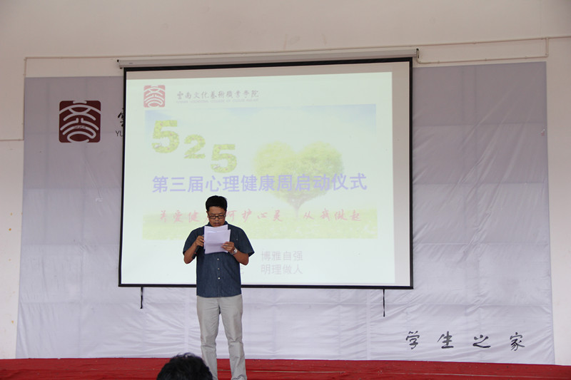 5月25日,云南文化艺术职业学院院团委学生处 心理健康与教育咨询中心举办第三届“5.25”心理健康活动周开幕式,本次活动的主题是“关爱健康,呵护心灵,从我做起”。活动在学院3号教学楼学生之家举行,参会的有学院相关领导、教师和各系的学生。