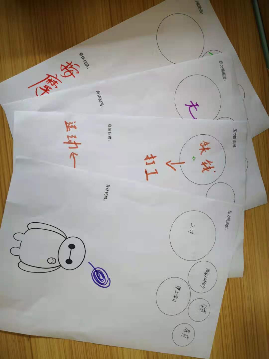 团辅伊始,老师们围坐成一个圆圈,让大家彼此之间都能被“看到”,并逐渐去与自己的“感受”联接。通过“抓手指”、大风吹等几轮互动后,老师们身体得到了放松,也感受到了场内能量的变化与流动,部分老师在杨教授的引导下,对自我进行了更深入地挖掘和探索。随后通过压力圈圈图和身体扫描进行压力分析,一起寻找压力应对策略、学习心理学减压方法,最后通过工作 、生活平衡轮建构帮助老师们清晰自己的现状,觉察到平时忽略的部分,找出希望有所改变的内容,然后制定计划,采取行动。