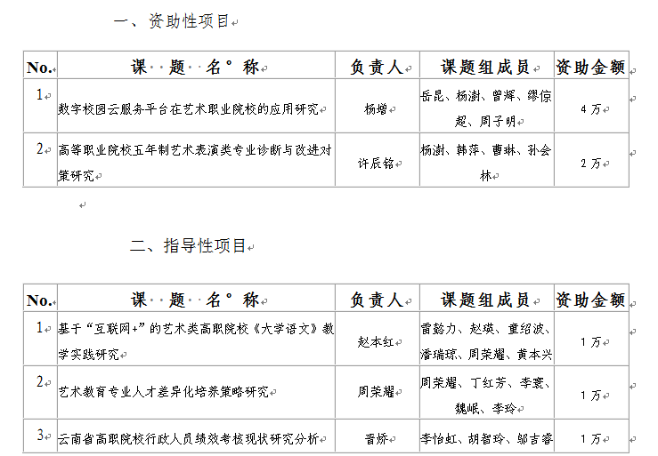 云南文化艺术职业学院2017年度云南省教育厅科学研究基金项目共收到申报课题6项,经专家委员会评审,拟立项5项,其中资助性项目2项,指导性项目3项。按照云教科〔2016〕32号《云南省教育厅关于做好2017年度科学研究基金资助性项目研究生项目和指导性项目申报评审工作的通知》要求,为体现课题评定公开、公正、公平原则,接受社会监督,现将拟定课题予以公示。公示时间为2016年10月10日至15日,如有异议,请在规定时间内以书面形式提出并附签名交至科研处。