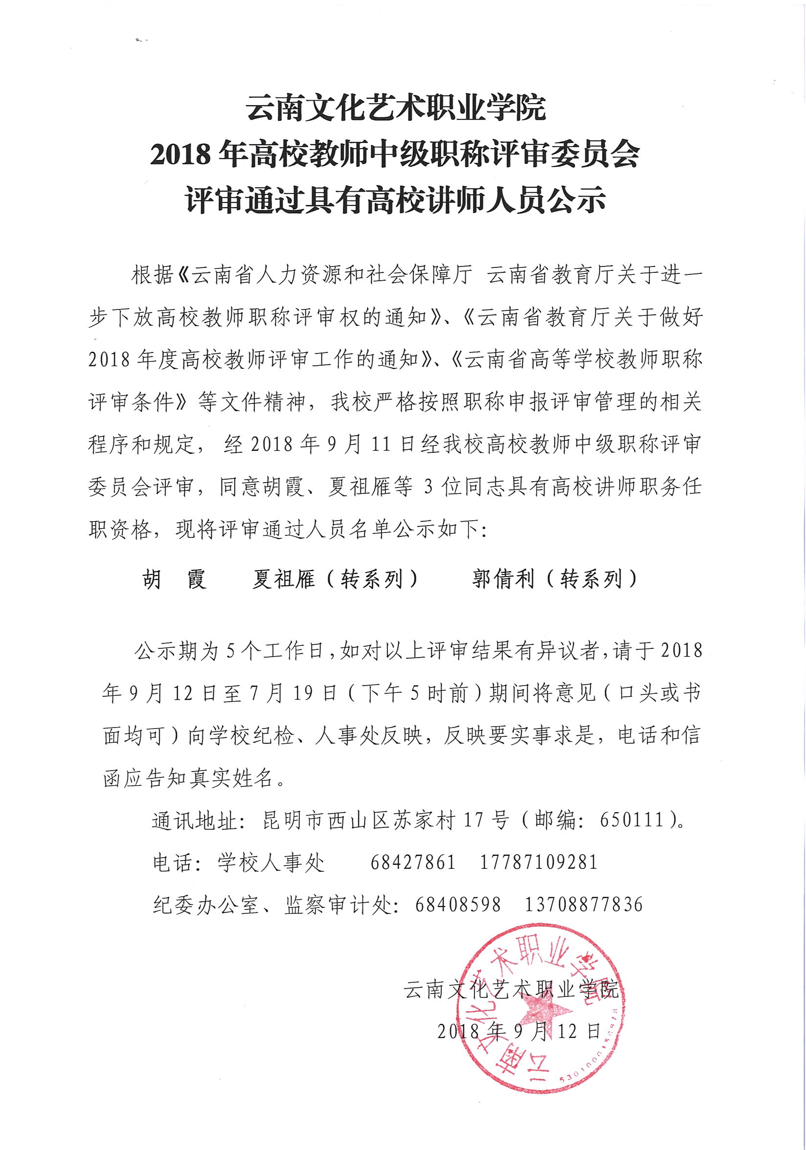 云南文化艺术职业学院2018年高校教师中级职称评审委员会评审通过具有高校讲师人员公示