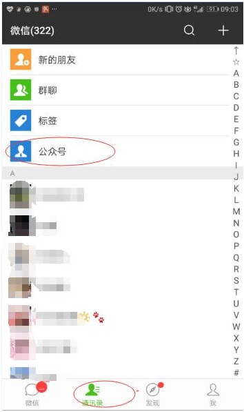 1、关注我校官方微信公众号:打开微信,点击“通讯录”,选择“公众号”;