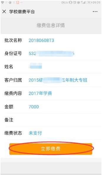 7、仔细核对缴费信息,确认无误点击“立即缴费”;另外本系统仅支持全额缴费,如果是需要办理助学贷款等分批缴费的同学,要把每一批次缴费的金额报给班主任,由各二级学院汇总后提交计划财务处后,再按批次导入缴费系统。