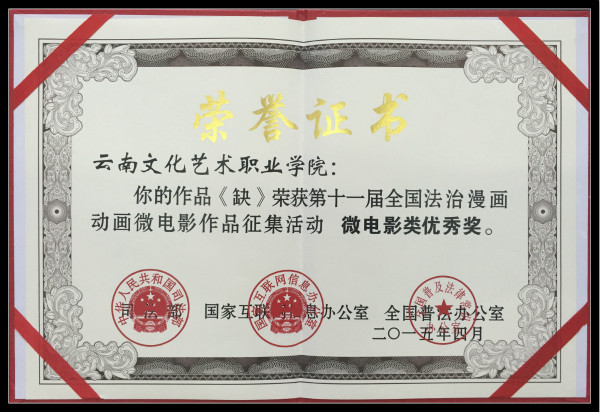 2015年4月,由我院传媒艺术系代表我院拍摄的微电影作品《缺》参加第十一届全国法治漫画动画微电影作品大赛荣获“微电影类优秀奖”。