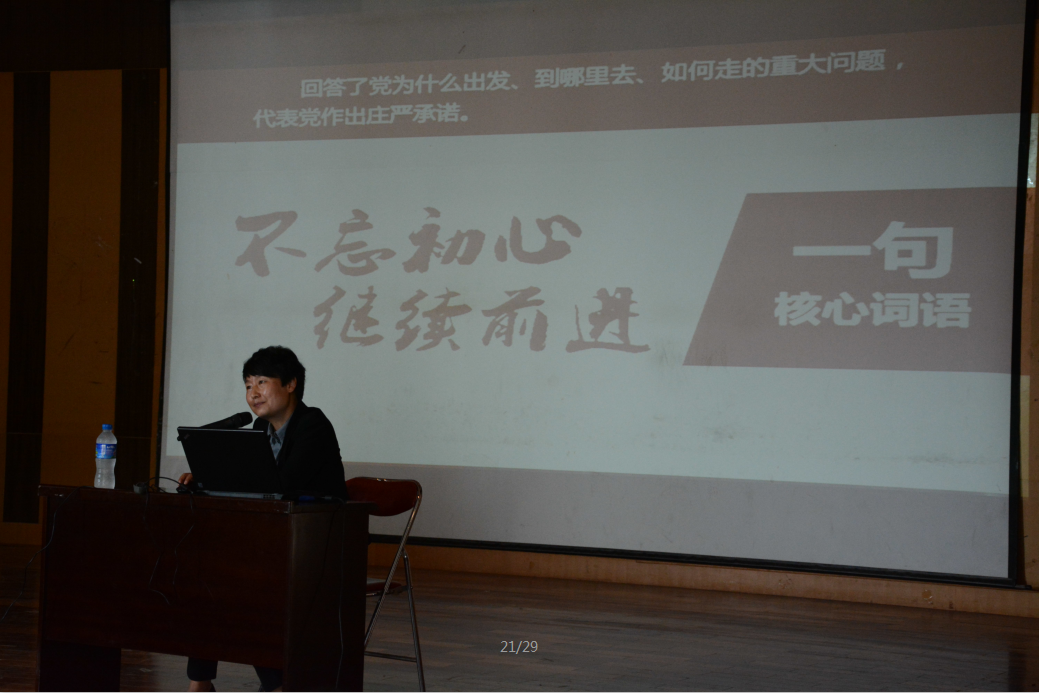 关于“不忘初心,继续前进”,熊教授进行了高度概括,即:不忘本质、不忘本来、不忘品格、不忘初衷、不忘来路。并且指出全党要时刻准备应对重大挑战、抵御重大风险、克服重大阻力、解决重大矛盾。强调习近平同志指出的,全党同志一定要不忘初心、继续前进,永远保持谦虚、谨慎、不骄、不躁的作风,永远保持艰苦奋斗的作风,勇于变革、勇于创新,永不僵化、永不停滞,继续在这场历史性考试中经受考验,努力向历史、向人民交出新的更加优异的答卷。