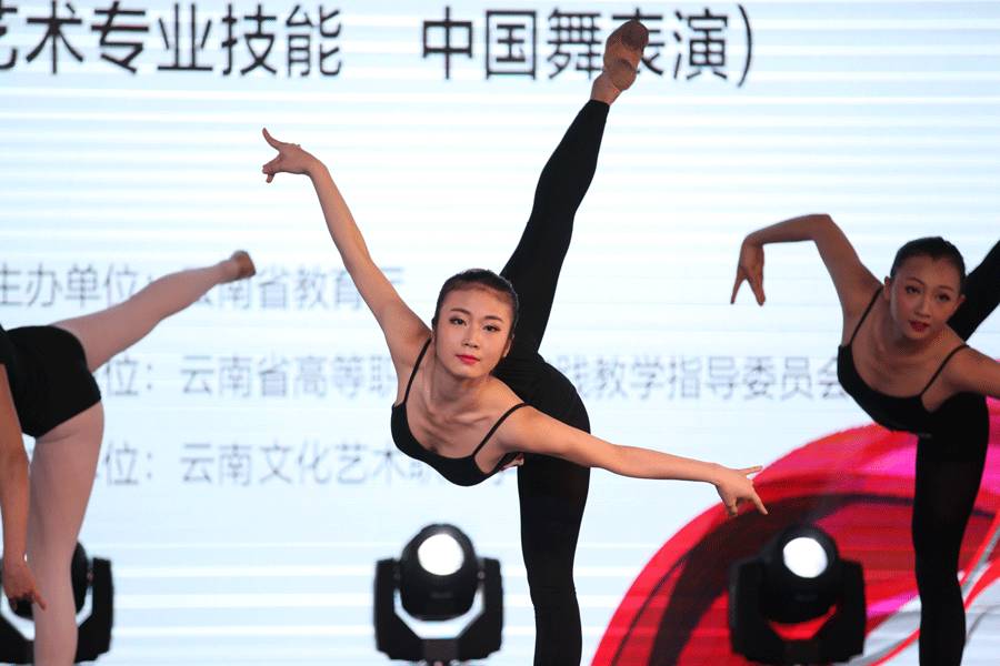 中国舞表演技能赛项进行了“技术技巧展示”“剧目表演”“舞蹈创编与表演、答辩”比赛环节。技术技巧主要考察选手基本功及技术技巧能力;剧目表演环节选手展示了藏族、彝族、古典舞等多样剧目;在“舞蹈编创与表演、答辩”环节,选手抽取试题音乐进行限时编创,完成主题阐述、舞蹈表演、提问问答。