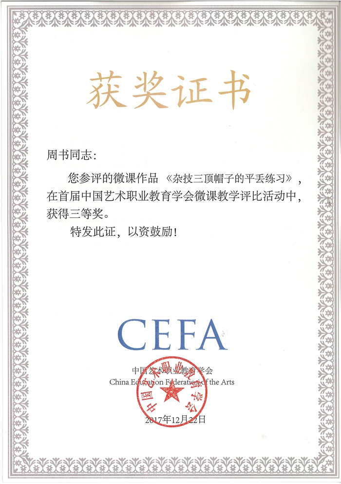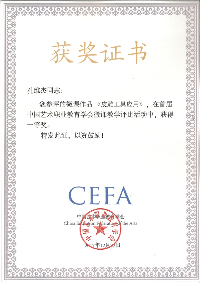 近日,中国艺术职业教育学会年会在北京隆重举行。本届学术年会揭晓了2017年首届微课教学评比获奖名单并举行了颁奖仪式。首届微课教学评比活动在会员院校引起了热烈反响。我校作为中国艺术职业教育学会会员院校,积极组织全院教师参与微课教学评比活动,选送了参赛微课作品10件,荣获“优秀组织奖”。在选送的10件作品中,孔维杰老师的《皮雕工具应用》荣获一等奖,周书老师的《杂技三顶帽子的平丢练习》荣获三等奖。