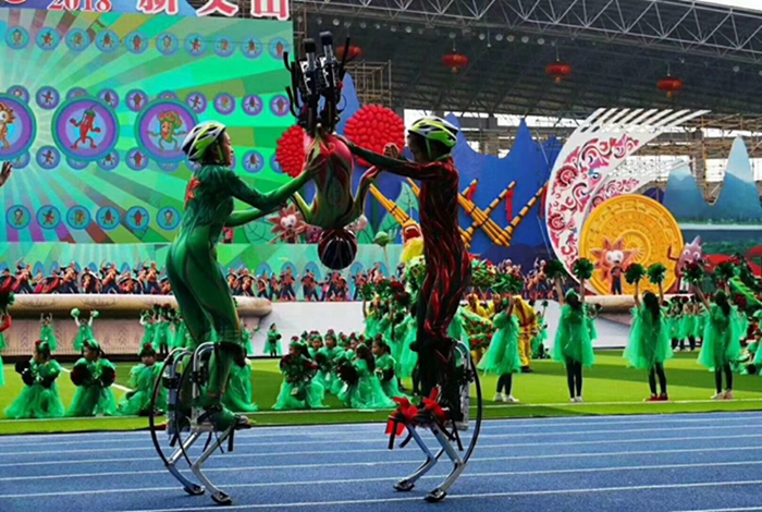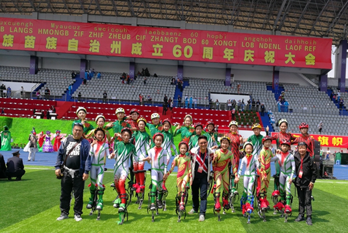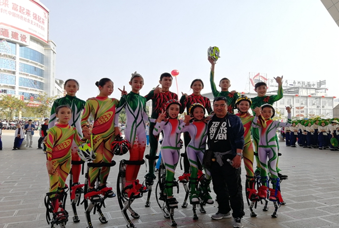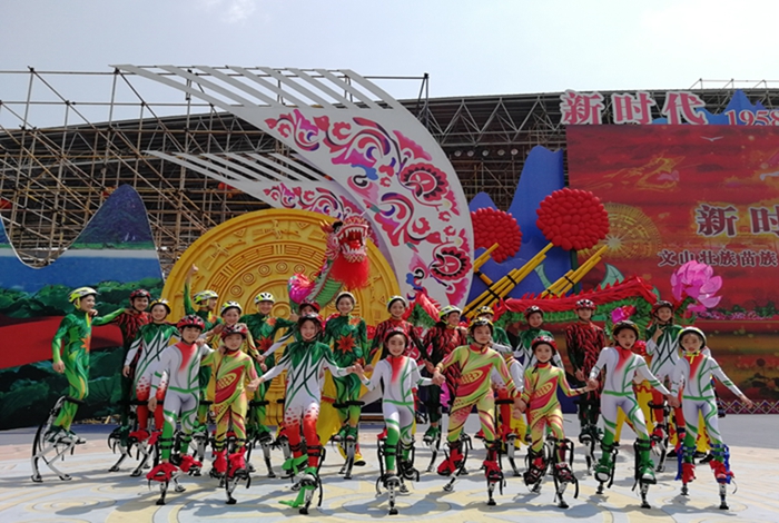 在全场4000多人的参演队伍中,弹力鞋(跳跳龙)技巧节目格外亮眼。孩子们的精彩表演,获得了组委会总导演和文山社会各界人士的高度赞誉。