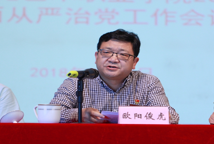 党委书记欧阳俊虎同志作《提高政治站位 层层传导压力 抓紧抓实全面从严治党各项工作任务》的工作报告。报告指出,2017年学校各级党组织和纪检部门认真贯彻落实省委、省纪委、教育部、高校工委、教育厅、文化厅决策部署,从政治建设、理论武装、责任落实、正风肃纪、监督执纪五个方面全面加强党对学校工作的领导,深入推进我校全面从严治党,为学校改革发展提供了有力的保障。他强调,2018年学校全面从严治党工作的总体要求是以习近平新时代中国特色社会主义思想为指导,贯彻落实党的十九大全面从严治党重大战略部署,以党章为根本遵循、以党纪为基本准绳,全面加强纪律建设,强化管党治党责任,聚焦中心任务,严明党的纪律,进一步明确党委在全面从严治党工作中的主体责任和纪委的监督责任,持之以恒落实中央八项规定精神,巩固“四风”治理和“三严三实”“忠诚干净担当”专题教育实践活动成果,不断增强基层党组织的凝聚力和战斗力,营造风清气正的教育政治生态和育人环境,为学校科学发展提供坚强的纪律保障。他强调,做好2018年学校全面从严治党工作一要加强党的领导,提高政治站位;二要坚持问题导向,抓好学校党的建设;三要不断加强党内监督,把纪律和规矩挺在前面;四要加大纪律审查力度,积极预防和遏制腐败;五要深入推进作风建设,完善监督机制 。