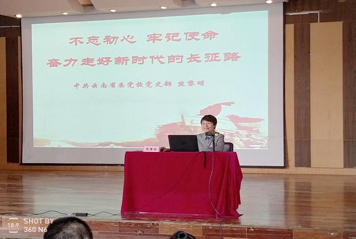 为深入学习宣传贯彻党的十九大精神,着力推动用习近平新时代中国特色社会主义思想武装头脑、指导实践、推动工作,根据省委高校工委关于做好习近平新时代中国特色社会主义思想宣讲团的通知精神,5月17日,学校邀请中共云南省委党校党史部副主任熊黎明教授作题为“不忘初心,牢记使命,奋力走好新时代的长征路” 的专题报告。报告会由学校宣传部部长张毅同志主持。