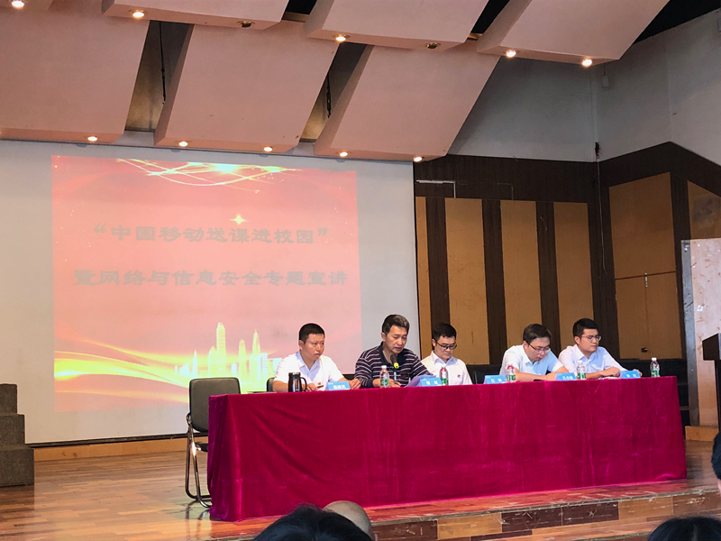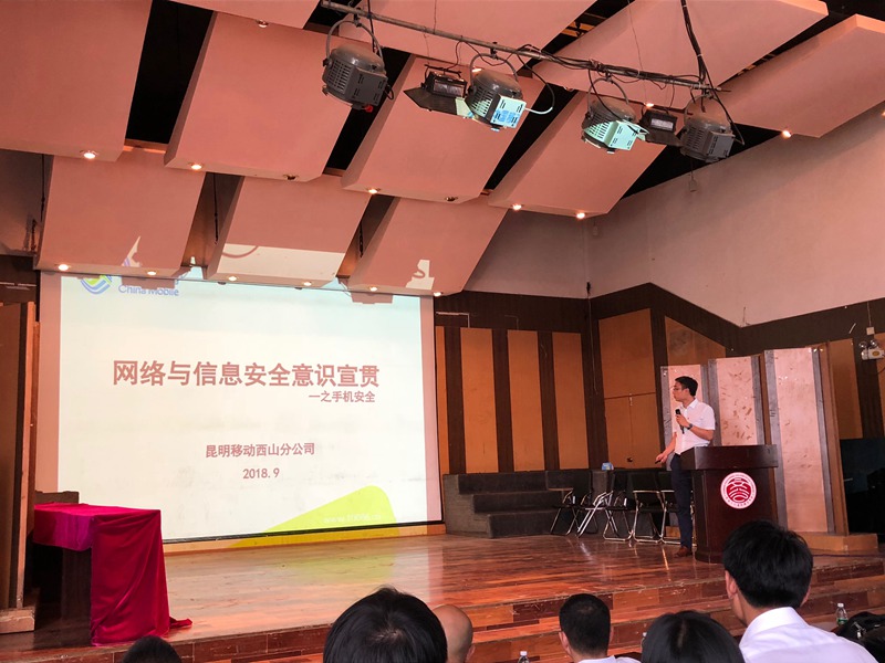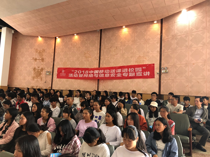 为深入贯彻落实《中华人民共和国网络安全法》和国家、省网络安全和信息化工作会议精神, 2018年9月27日,学校举办了“中国移动送课进校园”暨网络与信息安全专题宣讲活动。副校长翟斌、陈建民,综合艺术学院政治辅导员、班主任、2018级新生代表以及中国移动昆明分公司相关领导和业务主干等人员参加了宣讲活动。