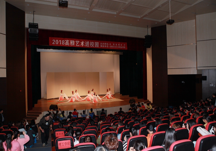 今年我校“高雅艺术进校园”系列活动以云南省滇剧院在我校的定向班同学为主力,他们精心排练了《游西湖》、《水漫金山》、《武松打店》等传统剧目,新编《长袖翩翩》、《梨园花蕾》、《武戏风采》等滇韵节目参演。10月-11月,我校艺术团将按计划进入滇池学院、云南工商学院、玉溪师范学院、津桥学院、云南农业大学五所高校进行演出。