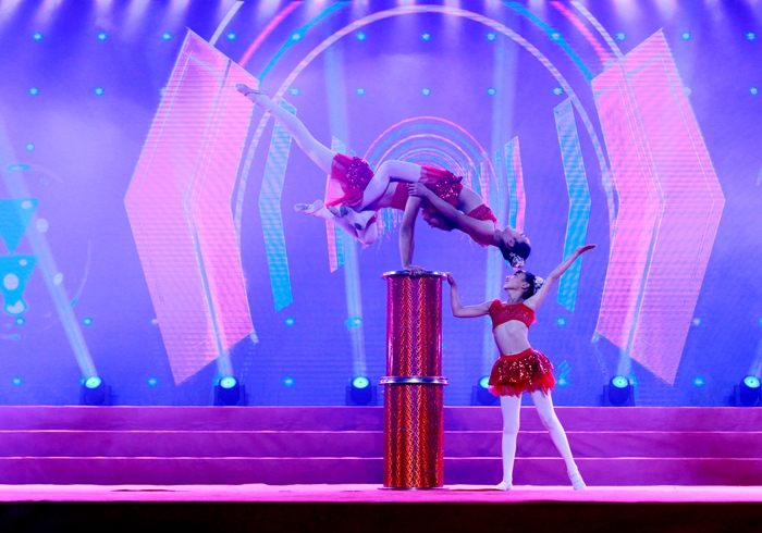 三个可爱的小同学表演的杂技《钻桶》,技艺高超,天真浪漫,欢快的音乐一下子把观众带回欢快的童年;《Fly—飞》醇厚的民族风和通俗的激情演绎,引起了年轻大学生们的共鸣;滑稽小品《飞刀》演员幽默诙谐,观众笑声阵阵;古朴、典雅的古筝合奏《战台风》,铿锵飘逸,余音绕梁;获奖作品《咿板嘟》民族风情浓郁,舞姿朴实优美,不时赢得阵阵掌声;一曲女声独唱《老师,我想你》把温暖幸福的浓浓情意传递给在场的每一位老师;杂技《柔术—雏鹰展翅》一下子把演出推向高潮,孩子们精湛的技艺,力与美的演绎,让在场的每一位观众惊叹不已,啧啧称奇;最后,同学们用云南最为熟悉的花灯歌舞,在《山水飞歌》中为演出画上了圆满的句号。