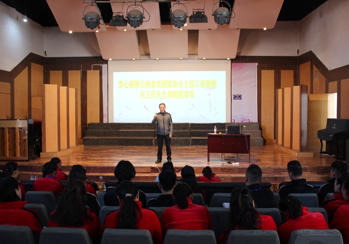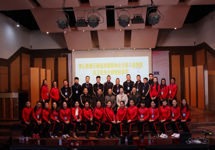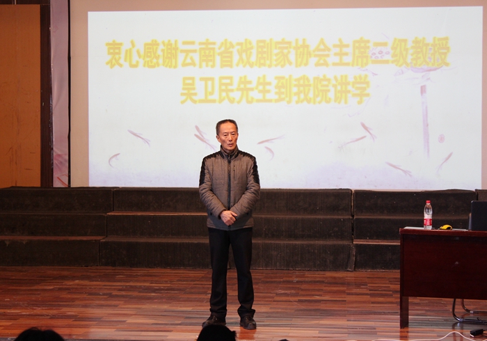 12月3日,2018年度“中国非物质文化遗产传承人群研修研习培训计划”云南文化艺术职业学院花灯剧、滇剧研修班邀请吴卫民教授与研修班学员们分享学习心得,讲授戏剧理论。吴卫民教授现任云南戏剧家协会主席,以吴戈为笔名出版学术著作17部,《田汉评传》《云南现代话剧运动史论稿》《戏剧本质新论》《当代戏剧诸象》《剧坛沉思录》、《中美戏剧交流的文化解读》、《中国内地新时期话剧导演研究》、《新中国戏剧艺术论》等,有200余篇学术论文发表,计约500余万字,其创作、研究成果获得国家级、省部级奖项44项,是一位德艺双馨,硕果累累的艺术家。