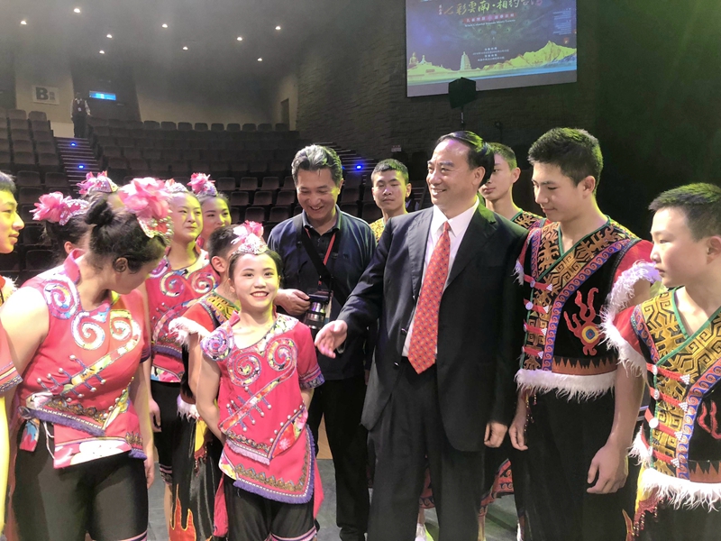 “七彩云南•相约台湾”文化交流活动在台湾新春期间掀起了“两岸一家亲,云台一家人”的文化交流热潮。云南省政协、云南省台办、云南省文联、云南省文旅厅、昆明市相关领导出席推荐会,高雄市市长、佛光山佛陀纪念馆馆长如常法师、佛光山住持心保和尚、高雄市民政局局长曹恒荣、高雄市教育局等各级领导观看了文化演出。云南省台办张朝德主任与我院参加演出的同学们亲切交谈并合影留念,对我院师生的表演给予充分肯定和高度赞誉。并希望明年云南文化艺术职业学院杂技学院的师生能继续前往台湾参与两岸文化交流活动,为弘扬中华传统文化,促进两岸文化相互交流、相互了解贡献一份力量。