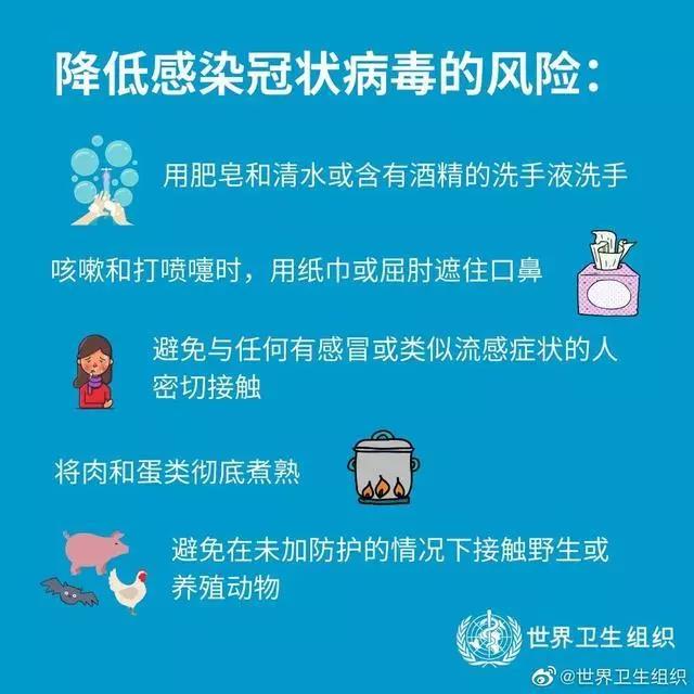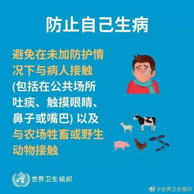 避免接触野生禽畜。避免接触禽畜、野生动物及其排泄物和分泌物,避免购买活禽和野生动物。避免前往动物农场和屠宰场、活禽动物交易市场或摊位、野生动物栖息地等场所。避免食用野生动物。要从正规渠道购买冰鲜禽肉,食用禽肉蛋奶时要充分煮熟,处理生鲜制品时,器具要生熟分开并及时清洗,避免交叉污染。