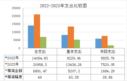 云南文化艺术职业学院(云南省艺术学校)2023年度一般公共预算财政拨款支出14492.43万元,占本年支出合计的69.16%。与上年相比增加5165.61万元,增长55.38%,主要原因是2023年共设4校区,校区增加带来了大量基础建设、设备购置工作,同时学院推进“双高”学校建设,配套项目资金增加,项目预算支出增加。2023年预算人数以2022年年末数为准,截止2022年末,学生人数较上年增加1757人,学生人数增加,学生的学习活动支出及教师的日常教学工作也同样增多,教育支出预算增加。