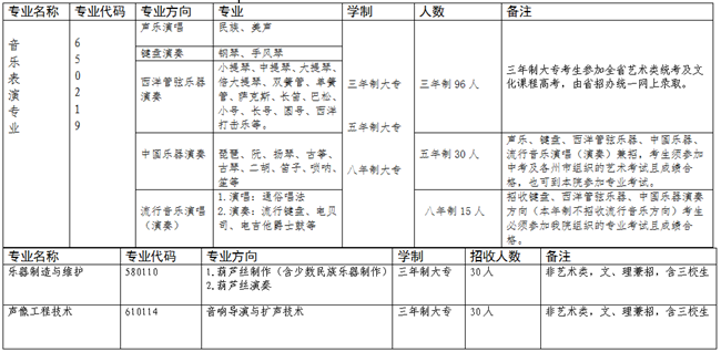 1.三年制音乐表演专业单招、统考招收高考艺术类考生(含三校生),在校学习三年,毕业获得专科学历。