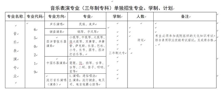 2020年音乐表演专业(三年制专科)单独招生考试专业方向如下: