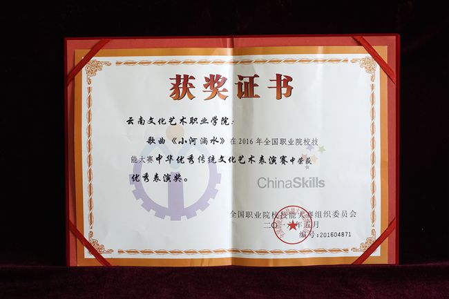 2016年5月3日到5月8日,音乐学院青年声乐教师王文静带领2015级三年制大专学生杨圣在天津参加了由中华人民共和国教育部、中华人民共和国文化部、中华人民共和国民族事务委员会、天津市人民政府主办;全国文化艺术职业教育教学指导委员会、天津艺术职业学院承办的2016年全国职业院校技能大赛开幕式––“中华优秀传统文化艺术表演赛”。参加此次活动的院校有云南文化艺术职业学院、中央音乐学院附中、浙江艺术职业学院、深圳艺术职业学院、湖北艺术职业学院、北京戏曲艺术职业学院、湖南艺术职业学院、天津艺术职业学院、安徽艺术职业学院、北京市国际艺术职业学校、沈阳音乐学院附属中等舞蹈学校、内蒙古艺术学院附属中等艺术学校、广东舞蹈戏剧职业学院、四川艺术职业学院等14所艺术职业学院。表演赛于2016年5月7日晚19点30分在天津大礼堂举行,音乐学院青年声乐教师王文静与杨圣表演男女声对唱云南民歌《小河淌水》获得大赛一等奖及优秀表演奖,得到教育部和文化部领导的高度好评。