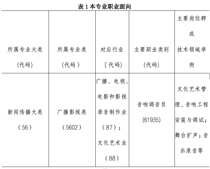 本专业培养理想信念坚定,德智体美劳全面发展,具有一定的科学文化水平,良好的人文素养、科学素养、职业道德和创新意识,精益求精的工匠精神,较强的就业创业能力和可持续发展的能力,掌握本专业知识和技术技能,面向广播、电视、电影和录音制作行业的音像制作、音响调音等职业,能够从事录音、混音、影视声音制作、音响调音、音频系统技术等工作的高素质技术技能人才。